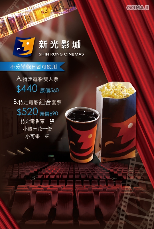 看電影的第一選擇【新光影城】!440元享特定電影雙人票、520元享特定電影票二張+小份爆米花+小杯可樂!平假日皆可使用,欣賞近期的強檔大片就買這檔!