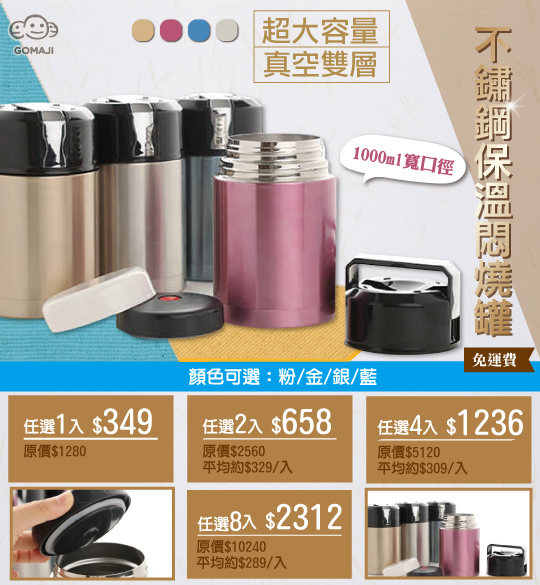 【超大容量1000ml寬口徑真空雙層不鏽鋼保溫悶燒罐】高質感設計,超大容量加上超強保溫,讓食物與飲品保持絕佳溫度,還有提把可以輕鬆帶出門!每入只要289元起,即可享有超大容量1000ml寬口徑真空雙層不鏽鋼保溫悶燒罐〈任選一入/二入/四入/八入,顏色可選:粉/金/銀/藍〉